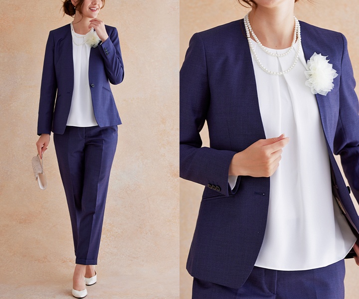 セレモニースーツには、スカートタイプとパンツタイプの2種類があります。スカートスーツはフォーマル感が強く、式典らしいきちんとした印象を与えます。フレアスカートは若々しく華やかで、タイトスカートは母親らしい上品な雰囲気になります。またパンツスーツは肌の露出を控えたい人やアクティブに動く場面におすすめです。ややカジュアル寄りですが、落ち着いた色味や素材を選べばフォーマルにも対応可能です。