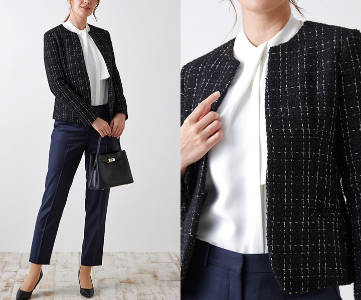 ツイードが特徴的なブラックのノーカラージャケットに、ネイビーパンツを合わせた40代らしいエレガントなコーディネートです。落ち着いた色味の中に、ツイード特有の質感がセレモニーらしい華やかな印象を加えています。さらにパンツスタイルを採用することで、母親らしいきちんと感とスタイリッシュさを両立した着こなしに仕上がります。