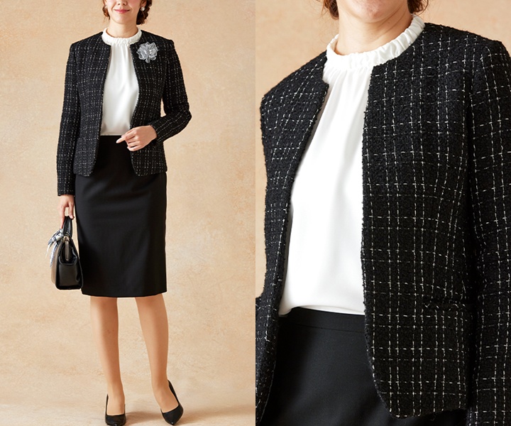 ツイード調のブラックジャケットは、上品さと季節感を兼ね備えています。シックなブラックスカートと合わせると、クラシカルで知的な印象に。全体をモノトーンで揃えることで統一感が生まれ、40代らしい大人の華やかさを感じさせるスタイルに仕上がります。お受験・卒業式・入学式など母親として様々なセレモニーシーンで活躍するコーデです。