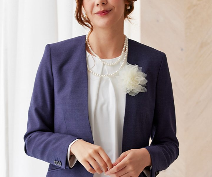 落ち着いた色合いのセレモニースーツは上品ですが、全体が暗く見えると地味な印象になりがちです。そのため小物を使って華やかさをプラスするのがおすすめです。定番のパールネックレスやイヤリングは、品格を保ちながら顔まわりを明るく見せてくれます。ベージュやネイビーなどのスーツには、シルバーや淡いゴールドのアクセサリーも相性抜群です。控えめな輝きを取り入れて、フォーマルシーンにふさわしい華やかさを演出しましょう。