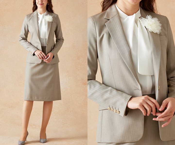 やわらかなベージュスーツで、優しさと上品さを兼ね備えています。セミフレアスカートによるAラインシルエットが体型をカバー。パールアクセサリーや白系のブラウスを合わせると、清楚かつ華やかな装いに仕上がります。入園式や春の式典など、母親らしい明るい印象を与えたいシーンにぴったりです。
