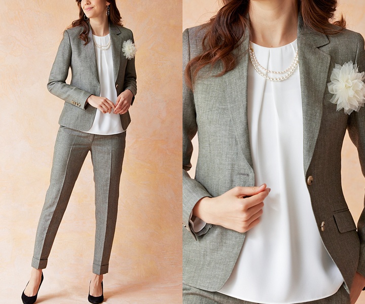 軽やかに着こなせるカーキカラーのスーツは、トレンド感と知的さを兼ね備えた印象を与えます。テーラードジャケットにテーパードパンツを合わせることで、きちんと感の中にも程よいカジュアルさを感じさせます。パールのネックレスやフラワーブローチで、セレモニーシーンにふさわしい華やかさをプラスするのがおすすめです。