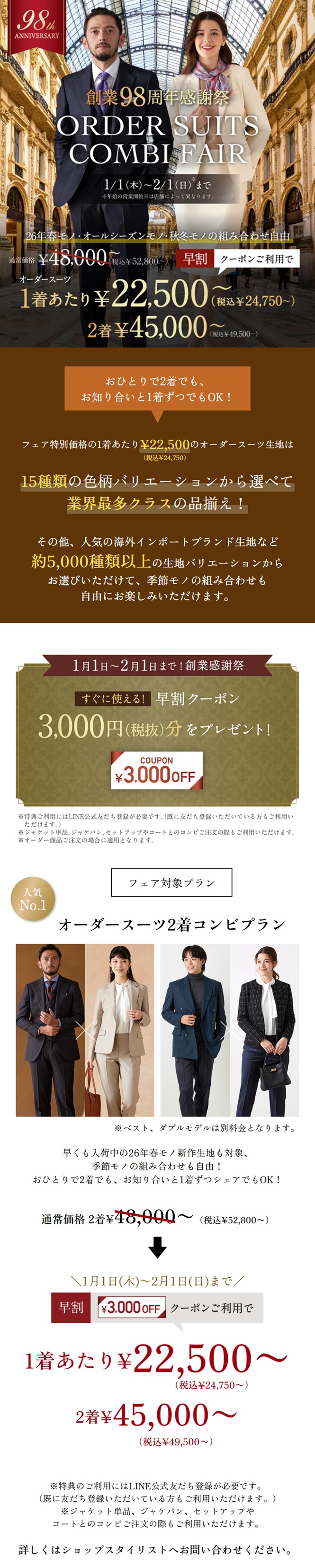 26年春モノ新作生地も対象で本格オーダースーツを