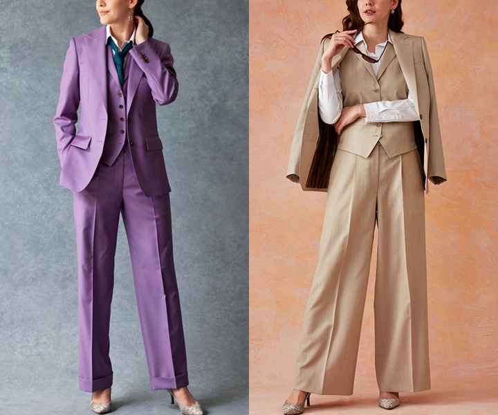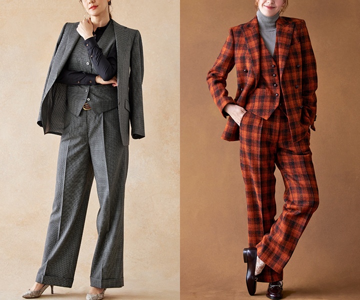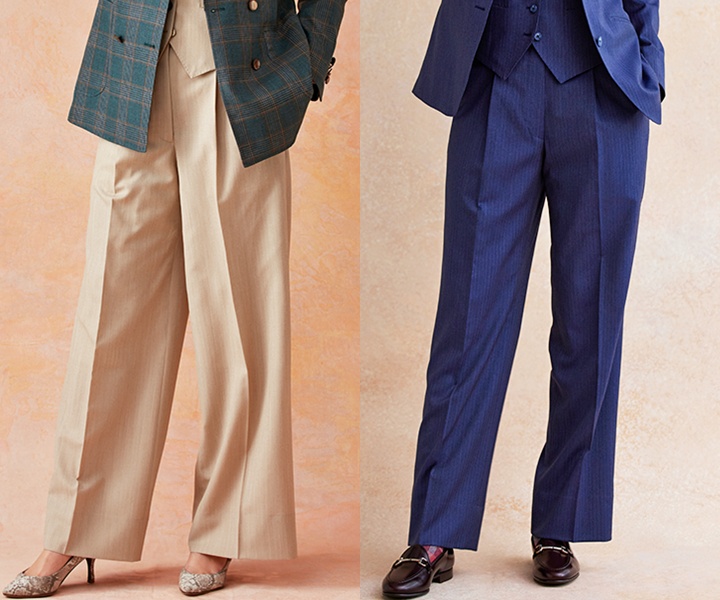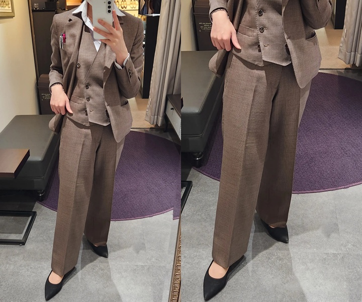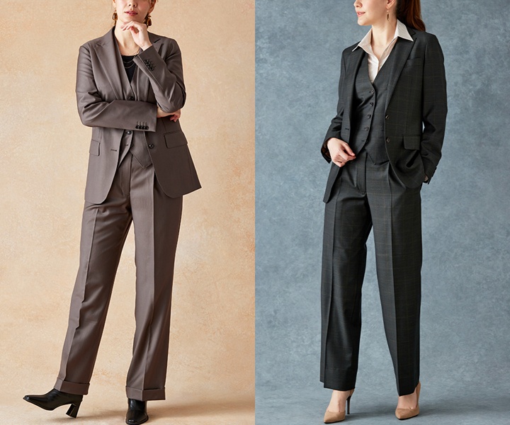 最近は、メンズライクなワイドシルエットのパンツを使った、ジェンダーレスな着こなしも多くの女性から人気を集めています。甘さを抑えたデザインは、落ち着きや品の良さを演出し、大人らしい洗練された印象を与えてくれます。オーダースーツ専門店であれば、ワイド感や丈感などを好みに調整できるため、体型や理想のイメージに合わせた自分好みのシルエットが実現します。