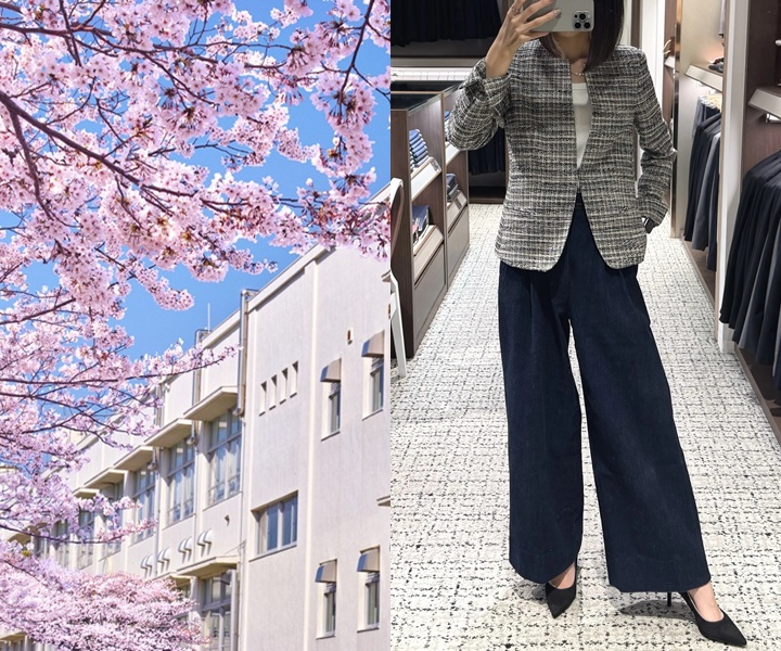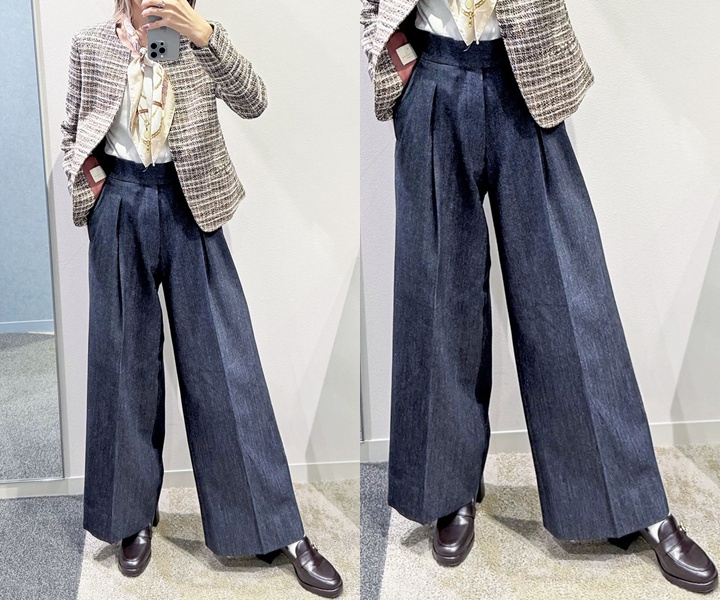 ハリのあるデニム素材のワイドパンツを合わせたスタイルで、軽快な印象を与えます。パンツの太さが際立ち、横への広がりを感じさせるシルエットが特徴です。ベージュのチェックジャケットと合わせることで、ワイドパンツの存在感を活かしつつ、こなれた雰囲気に仕上がります。