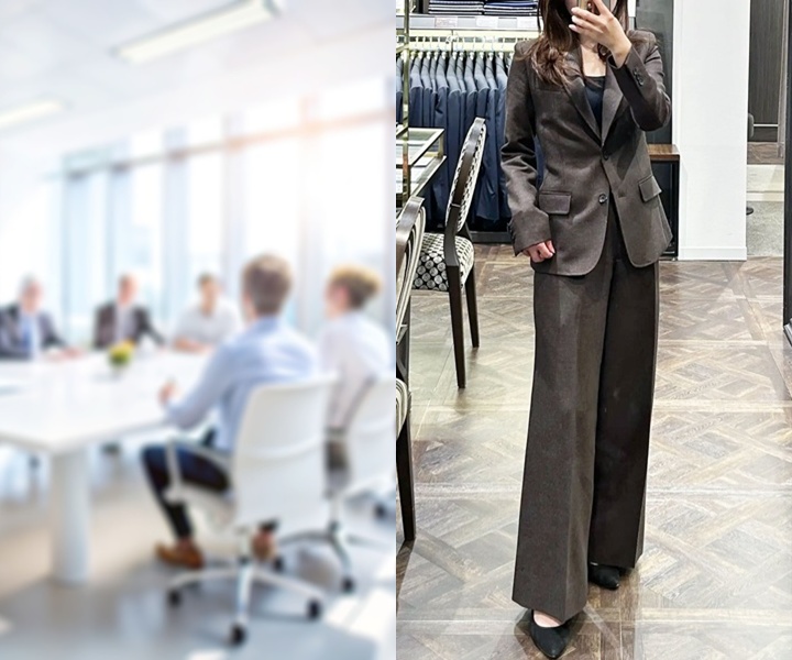 女性の場合、ワイドパンツスーツをオフィスカジュアルやビジネスカジュアルを想定したビジネスシーンで取り入れるのもおすすすめです。シルエットや色柄を工夫することで、きちんと感を保ちつつ程よい抜け感を演出することができます。ただし、取引先対応がある場合や、金融・士業・公的機関などの保守的な職場では、カジュアル過ぎる印象を与えてしまう可能性があるため、着用は慎重に検討しましょう。