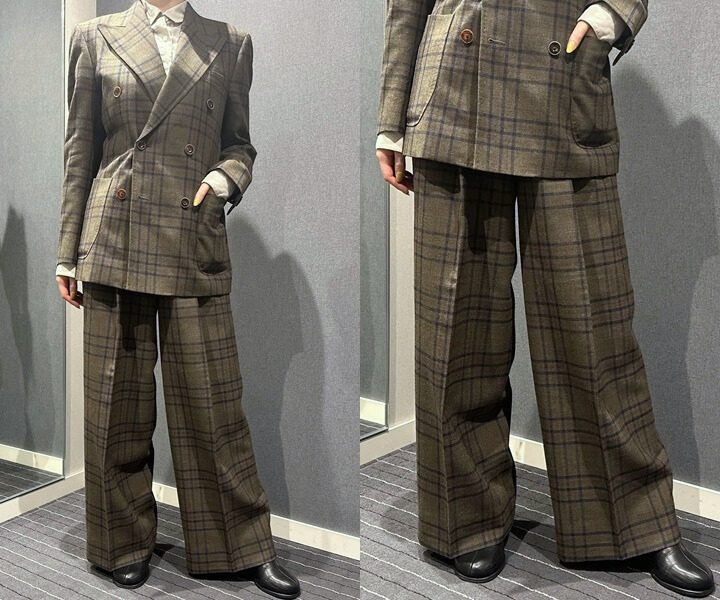 落ち着いたカーキのチェック柄に、ワイドパンツを合わせた、存在感のあるスーツスタイルです。しっかりとしたワイドシルエットが、コーディネート全体にゆとりと迫力を与えます。チェック柄の表情が加わることで、コーディネートに奥行きがプラスされます。落ち着いた色味の中に個性が光る着こなしです。