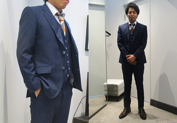 「ネイビーカラーにブラウンのストライプが入った、イタリアンスタイル『アズーロ・エ・マローネ(Azzurro e Marrone)』の王道スタイルがとても気に入りました。今回はスリーピーススーツで仕立てたので、より一層上品で素敵な仕上がりになったと思います。」