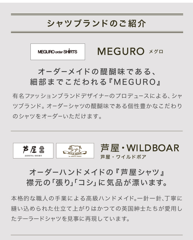オックスフォードシャツは、一般的なシャツやオーダーシャツの中でも素材感のある生地となりますが、ビジネスシーンの定番 “レギュラーカラー” との組み合わせも様になります。キッチリとした印象を与える襟型ですが、番手が太い生地はカジュアルに、番手が細い生地はフォーマルと、オックスフォード地のなめらかさや光沢感で、上品な着こなしを楽しめます。