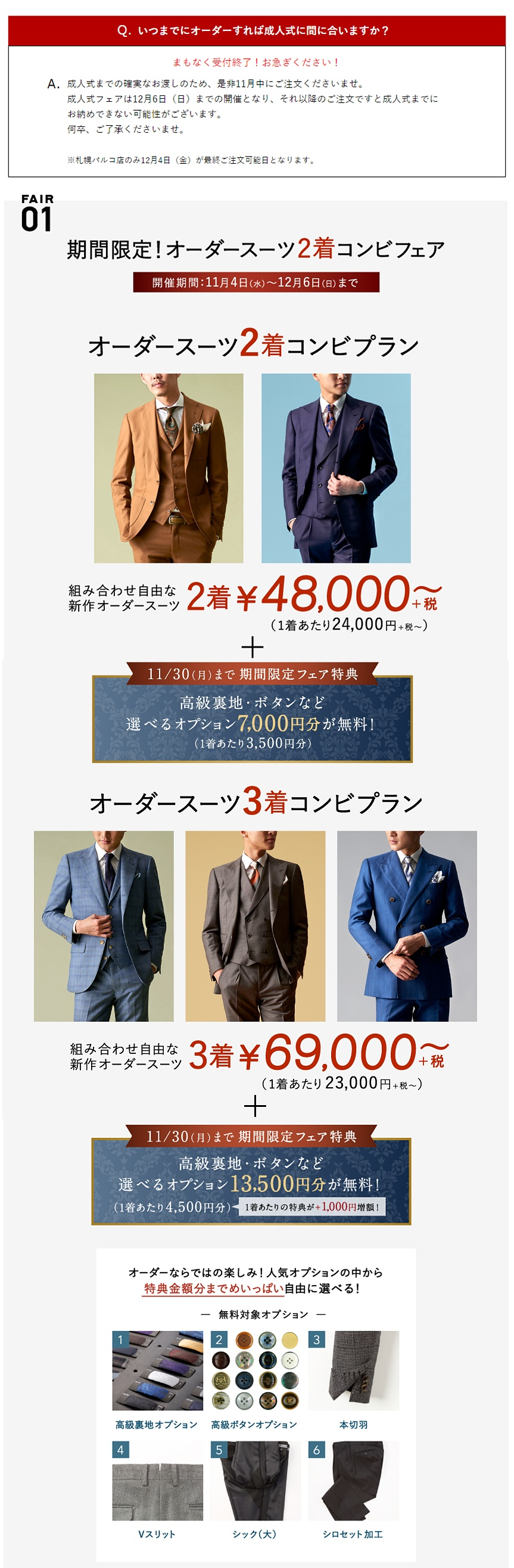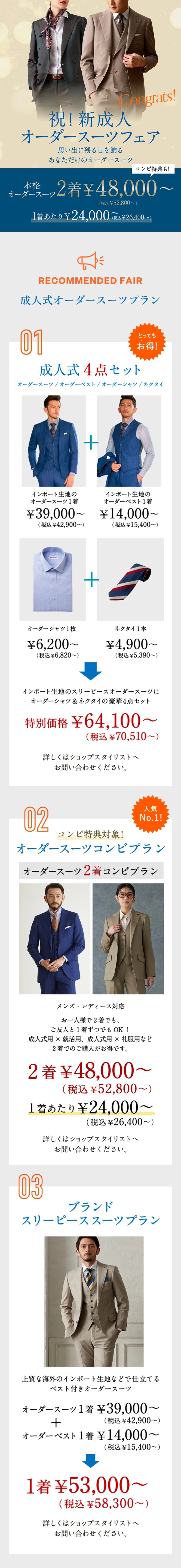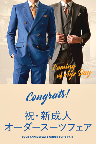 一生に一度しかない成人式、より特別なスーツを着用したい方におすすめなのがオーダースーツ。選べるスーツモデルや生地の色柄が豊富に揃っているので、こだわりの1着を作ることが出来ます。一見無地のようで実は織柄のある、ピンチェック・シャークスキン・ヘリンボーンなどは、ちょっと派手さを抑えたい方に良いでしょう。