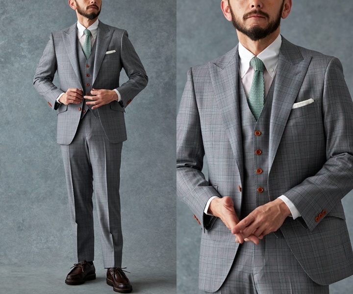 ブルーグリーンスーツは、個性と品格を兼ね備えたコーディネートをしたい際に最適です。深みのあるグリーンが洗練された雰囲気を強調し、貝ボタンが上品なアクセントになります。ネイビーシャツとペイズリーネクタイで統一感を持たせ、シックでスタイリッシュなコーデとなります。