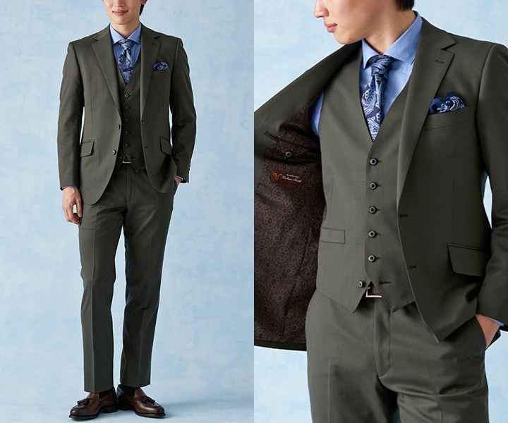 カーキスーツは、トレンド感のあるコーディネートをしたい際に最適です。表地は無地のカーキカラーで落ち着いた印象があり、裏地には柄を取り入れて遊び心を追加。シンプルながら個性を感じるスタイルに仕上がります。ペイズリー柄のネクタイ&チーフで統一感を演出し、爽やかさと洗練さを両立したコーデです。