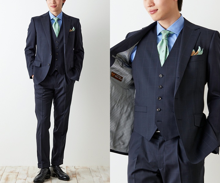 ネイビースーツは、シンプルで清潔感のあるコーディネートをしたい際に最適です。ネイビースーツにベストを着用することで、大人の落ち着きと品格を感じさせるスタイルを演出します。ブルーシャツとグリーンのネクタイ・チーフを組み合わせることで清涼感のあるコーデになります。