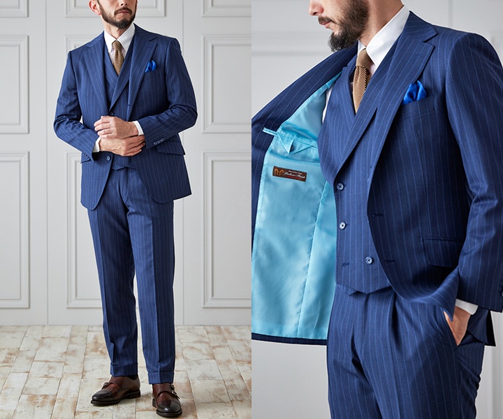 ストライプ柄スーツは、チェック柄と同様に、ラインの幅によってスーツの印象が変わります。 細身のストライプは繊細でドレッシーな印象を醸し出し、太めの目立つストライプは華やかで強い印象を持たせます。