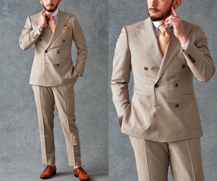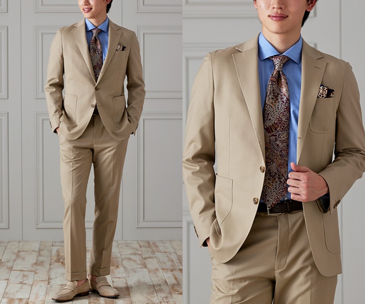 ベージュのオーダースーツは、ナチュラルで軽やかなコーディネートをしたい際に最適です。ライトベージュスタイルは、色合いが柔らかく、爽やかな印象を与えます。シューズもベージュで揃えることで統一感を出しつつ、ネクタイやチーフを柄ものにすることで洗練されたコーデです。
