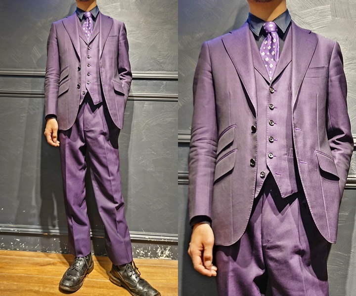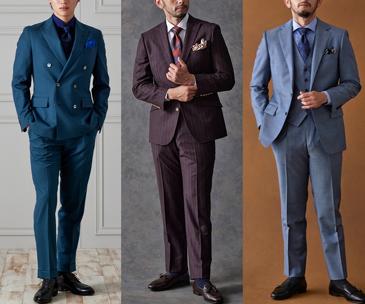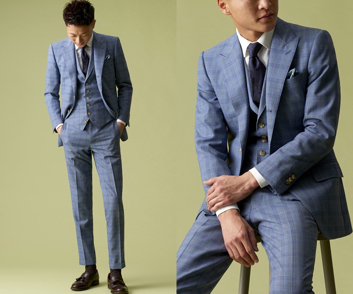 ブルーグレーのオーダースーツは、爽やかさと落ち着きのあるコーディネートをしたい際に最適です。程よい明るさのあるブルーグレーのスリーピーススタイルで、洗練された印象を与えます。濃い目のパープルのネクタイがアクセントとなり、個性と深みが加わった大人の色気を感じさせるコーデになります。