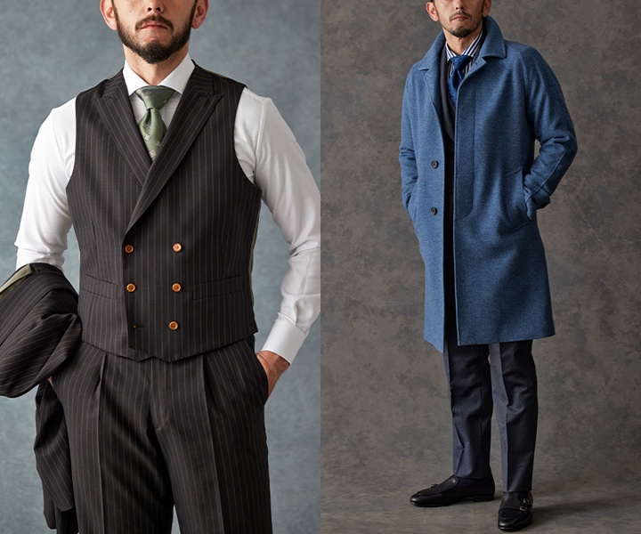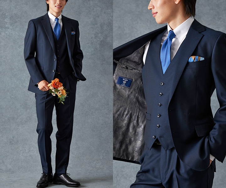 ベスト(ジレ)は通常、ジャケット、ベスト、パンツが同じ生地で作られ、格式の高い華やかな印象を与えます。 注意点として、ベストのサイズが大きいとだらしなく見えてしまいます。意識すると良いポイントは、パンツとの境目が見えない丈、またワイシャツやベルトが見えない丈のベストを選びましょう。