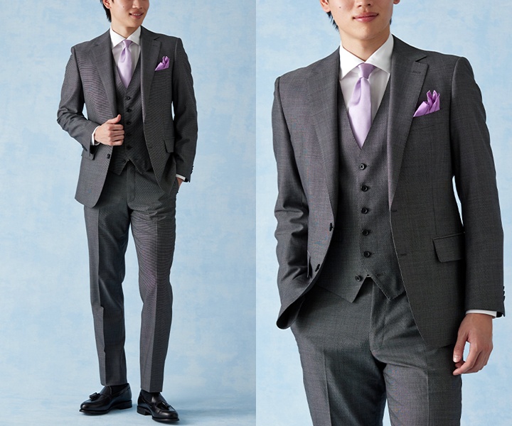 グレースーツは、大人っぽく知的な雰囲気のあるコーディネートをしたい際に最適です。上品で落ち着いた印象を与えるグレーのスリーピーススタイルで、クラシックながらも現代的なバランスを保った印象を与えます。同系色のパープルチーフとネクタイを組み合わせた3色コーデです。