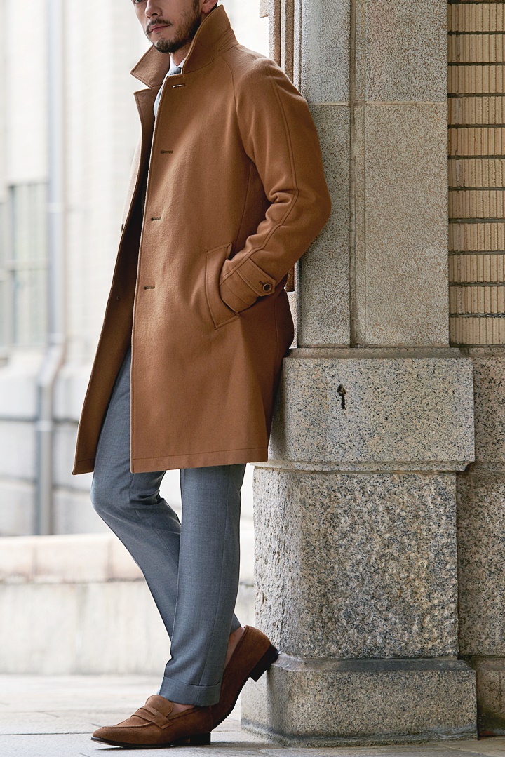 ステンカラーコート(バルカラーコート)のスーツとの着こなし方