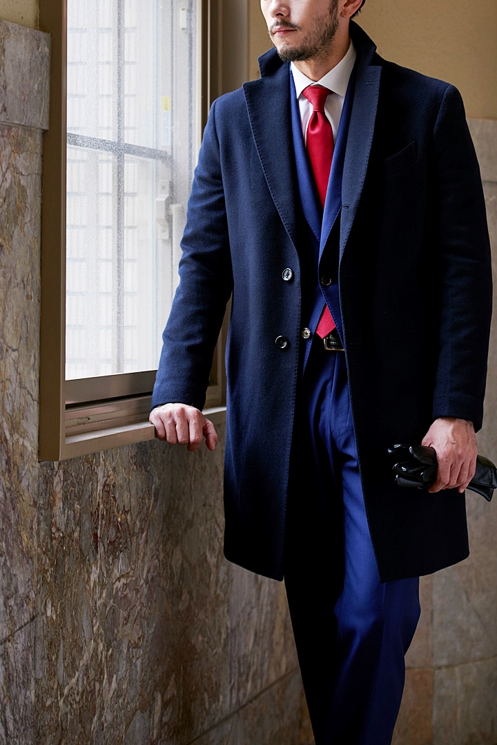 艶感のあるネイビー無地のチェスターコートです。上品な印象があるためグレーやネイビーなどのビジネススーツはもちろん、カラースーツなどカジュアルなスーツとの組み合わせにもおすすめです。