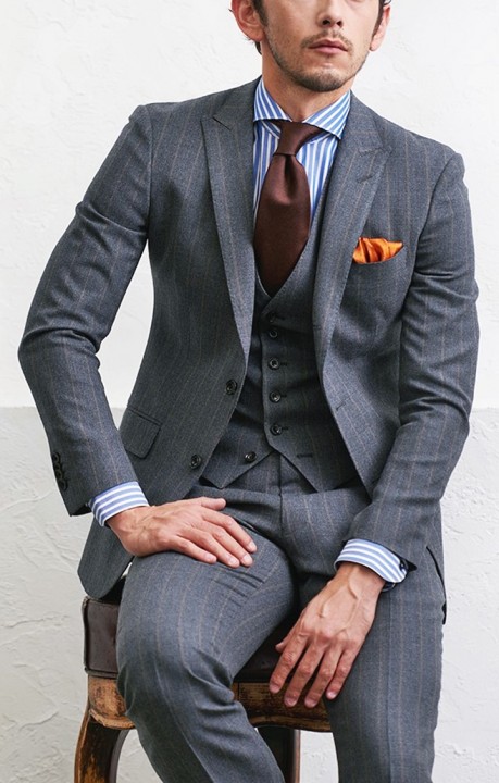 王道のグレーカラーに同色系の繊細なストライプが入ったスタイル。ブルーのシャツやネクタイを合わせた清涼感溢れるコーデです。※モダンクラシック&レダ