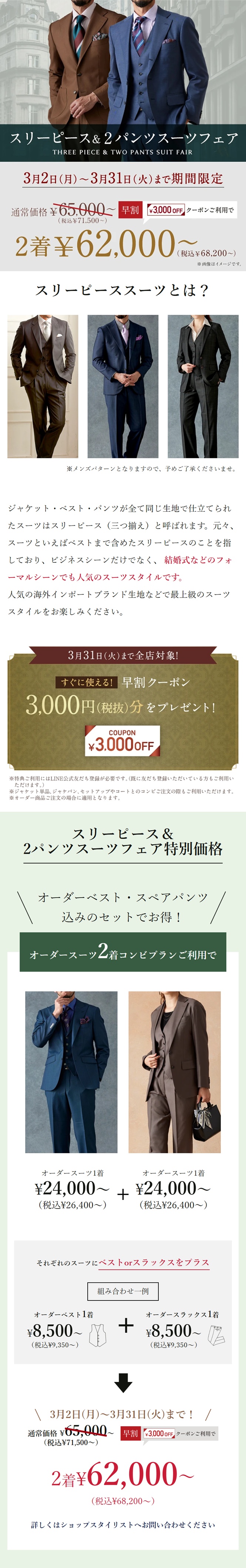 ▶本格オーダースーツ2着¥62,000~(税込¥68,200~)