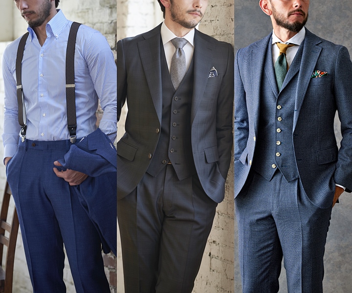 秋冬に人気のスリーピーススーツの場合は、ハイウエスト(サスペンダー使用)で着用することが多いので、タックを入れてエレガントに着こなすことができます。ローライズの場合は、腰回りのゆとりがわかりやすくなってしまうので、ノータックを選ぶと良いでしょう。
