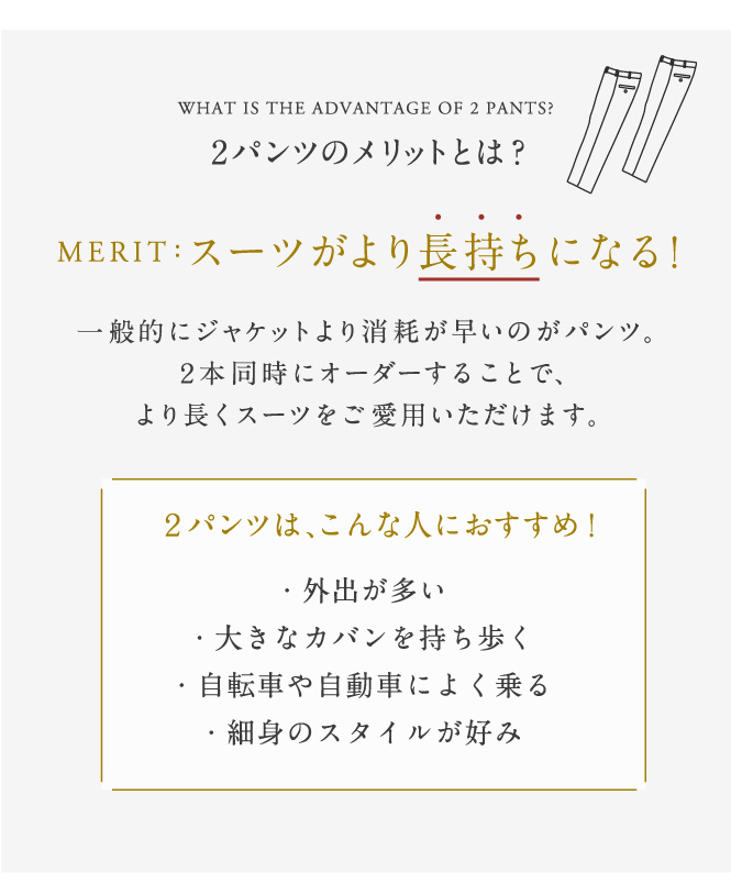 パンツをスッキリと穿きこなしたい方、太もも、ヒップなどが細身か標準体型の人、脚を細く見せたい人におすすめです。パンツのブカブカする感覚が苦手な方にも良いかも知れません。無駄な遊びが少なくスタイリッシュに着こなせます。ビジネスシーンでは、印象を良く見せたい接客業や事務職の方などに良いかも知れません。生地は、無地でも柄モノでもスッキリとしたシルエットとなり、紳士的なイメージを演出した方にもオススメです。