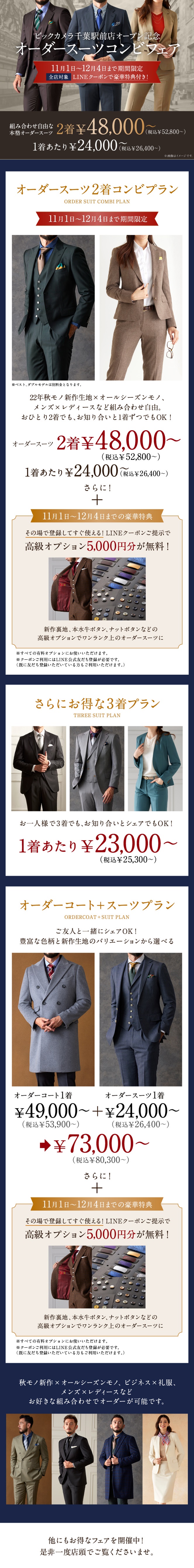 ▶本格オーダースーツ2着¥46,000~(税込¥50,600~)
