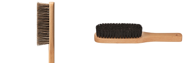 実際に選ぶとなると、一長一短がありますが。ハリやコシに特徴のあるイギリス生地には、豚毛のブラシでも良い。柔らかさや艶感が特徴のイタリア生地には、馬毛のブラシ。特に、カシミヤなどデリケートな生地には、柔らかい馬毛のブラシがおすすめです。また、天然毛のブラシは、静電気が起こりにくく、埃の付着を抑えてくれます。