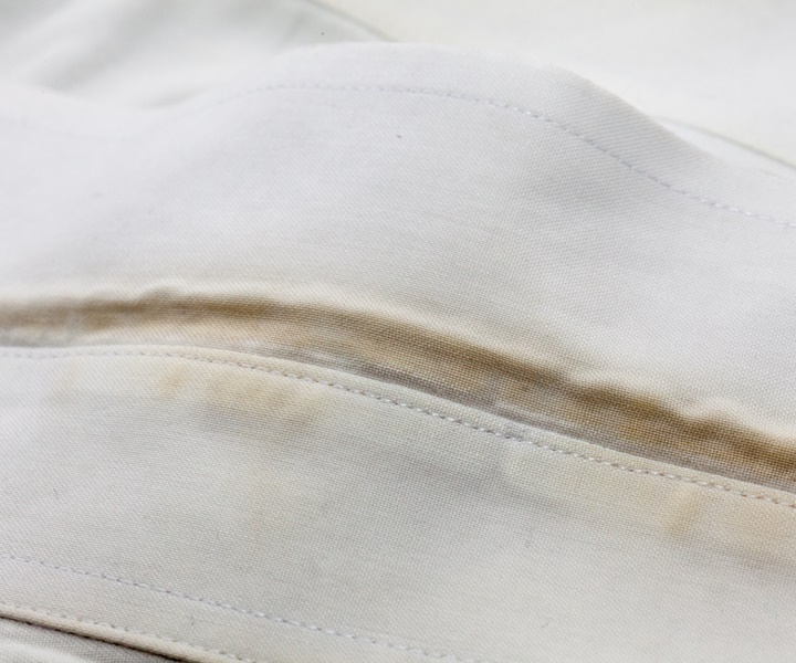 襟の黄ばみの原因の多くが人間の皮脂によるものです。特に夏は汗や紫外線の影響で汚れやすい季節です。襟周りは人間の肌(首・肩)と生地がこすれやすく、汚れが繊維の奥まで入るため、通常の洗濯だけではなかなか落とすことができません。さらに、汚れに含まれるタンパク質が空気に触れて酸化することで黄ばみに変化します。黄ばみをそのままにしておくと次第に濃くなることもあるため、日頃から丁寧なケアを心掛けましょう。