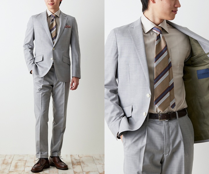グレージャケットの色は、冒頭でも触れたように、濃淡の違いで与える印象が大きく変わります。明るいグレーやライトグレーは、都会的・洗練・上品な印象になります。全体的に膨れて見える場合があるので、サイズ選びに注意しオーダージャケットなど体型にあったものを選びましょう。ダーク系のグレーは、ネイビーの次にビジネスマンに多く着用されているチャコールグレーなどがあり、品格のある印象になります。柄は、ドレスライクに見せたい場合は無地、カジュアルライクに見せたい場合はチェック柄などがおすすめです。ストライプ柄は他の柄よりもインパクトのある装いになるため、着用シーンを明確にし選ぶようにしましょう。