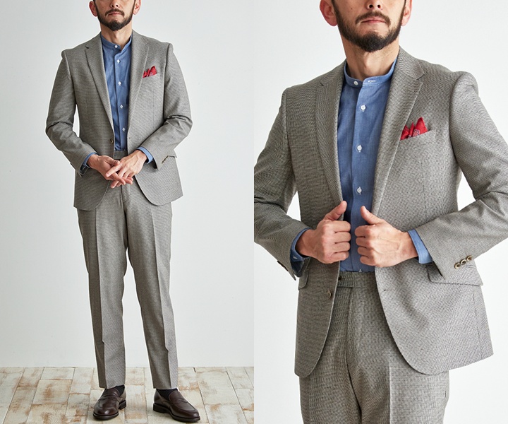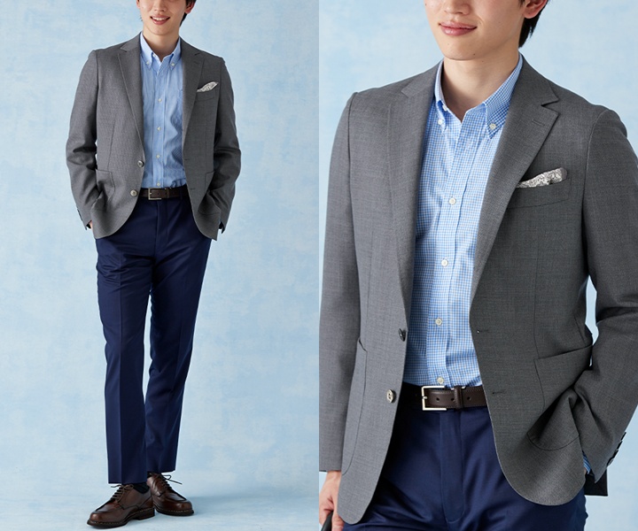 スーツとは違い、スラックス・チノ(カラー)パンツなど、季節によってスタイルが変化できます。シャツやネクタイと組み合わせても違和感なく、グレージャケットスタイルになります。