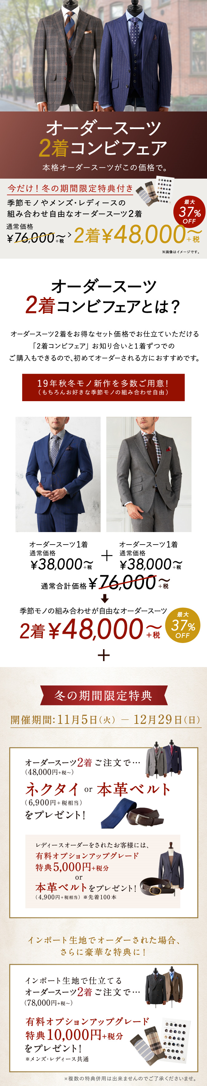 ▶本格オーダースーツ2着¥46,000~(税込¥50,600~)