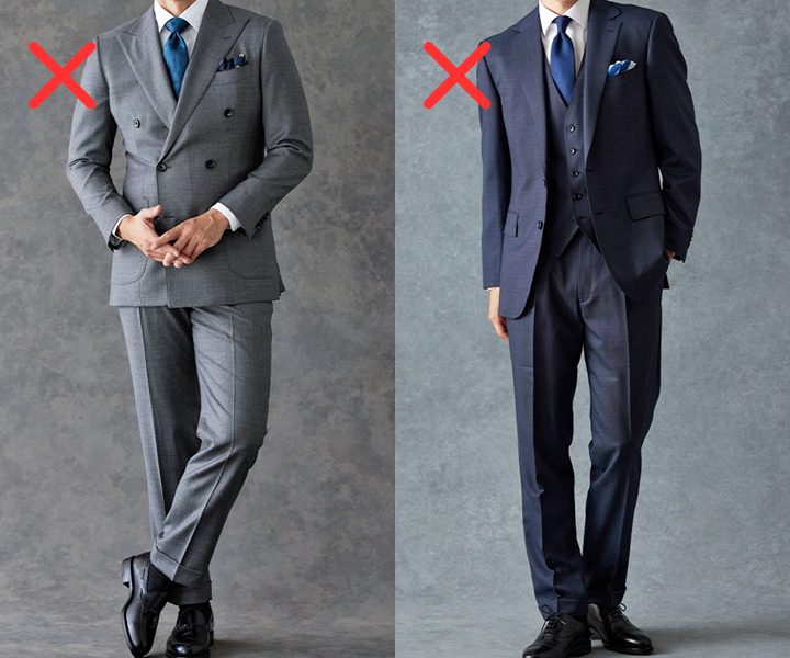 ダブルスーツやベスト付きのスリーピーススーツは、デザイン性や格式が高いため、入社式では存在感が出すぎてしまうことがあります。また、「偉そう」「生意気」といった印象を与える可能性もあるため、新入社員として参加する場では、控えめでシンプルなデザインを選びましょう。