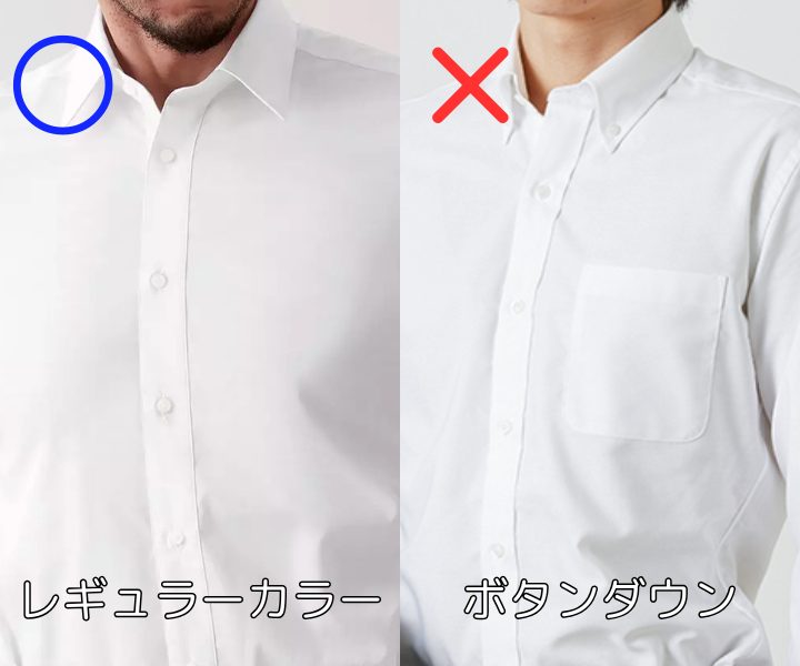 礼服・喪服に合わせるワイシャツは、白の無地が基本です。襟型はレギュラーカラーやワイドカラーなど、装飾の少ないシンプルなデザインが適しています。一方、ボタンダウンはスポーティーでカジュアルな印象を与えるため、葬式などの弔事では控えた方が良いでしょう。