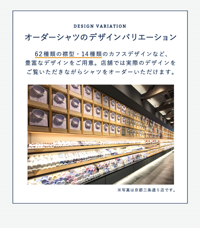 襟の形のバリエーションやカフスデザインも幅広い形から選ぶことができます。また、色柄で個性を出したい方は、生地・素材からもこだわれるので、お気に入りのシャツとして毎日でも着たくなること間違いなしです。