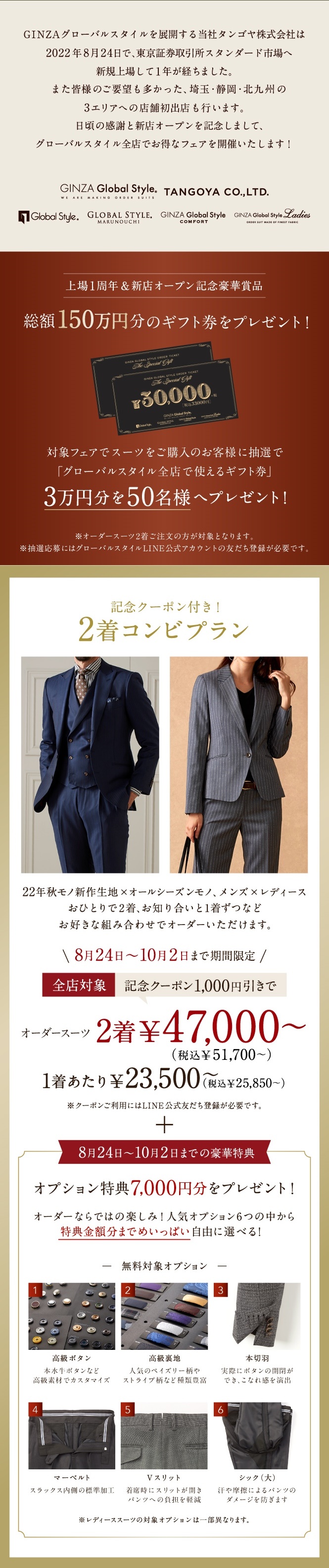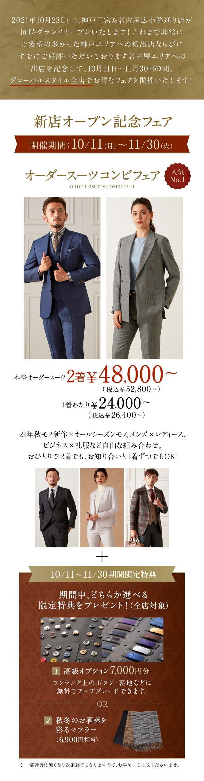 オーダースーツ専門店グローバルスタイルでは、期間限定のフェアが開催中です。ぜひこの機会に新年に向けたスーツをオーダーして、周りと差を付けるお洒落で格好良い1着にしてはいかがでしょうか。