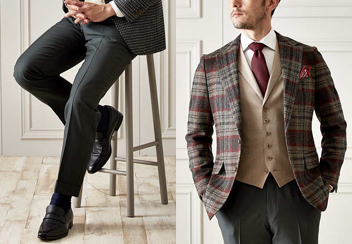 秋冬は、全体的にトーンが重くなりがちですが、あえてスラックスの色はダーク系にし、チェック柄のジャケットと合わせるなど柄モノとの組み合わせでまとめると良いでしょう。ジャケットの下に“ベスト”を着るとフォーマル感がでます。