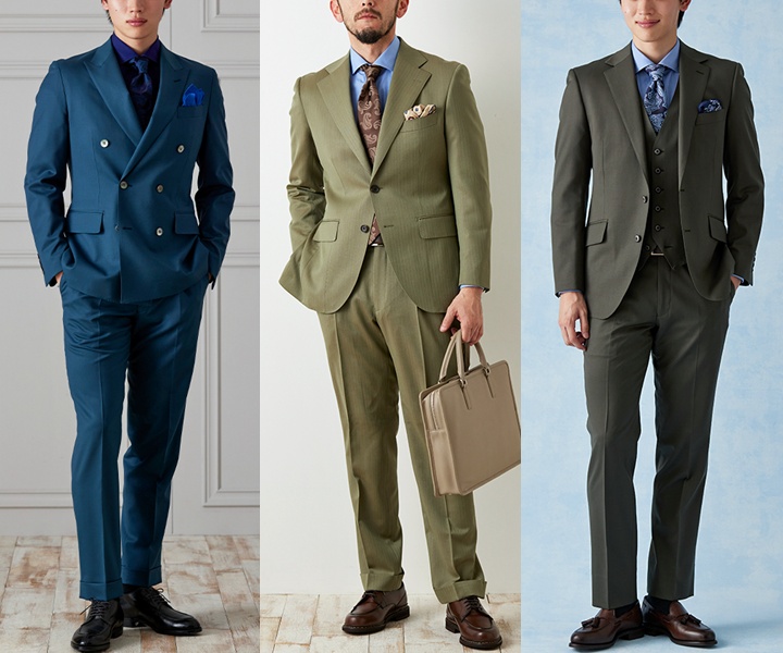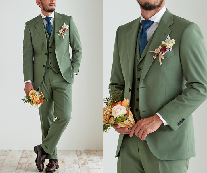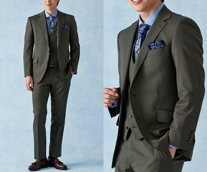グリーン・カーキスーツは定番カラースーツに比べて、個性的でおしゃれさがあります。ビジネスシーンでは、特にアパレル関係やオフィスカジュアルが良いとされている方に人気があります。