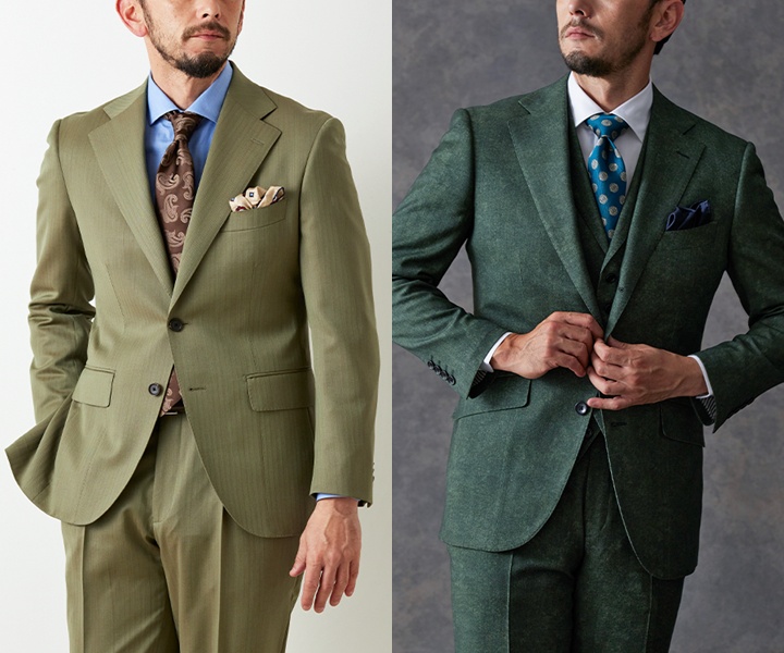 グリーンスーツの色味は、「ダークグリーン」「オリーブグリーン」「モスグリーン」などさまざまです。色を選ぶ際には、着用シーンをイメージすると良いでしょう。ビジネスシーンでは、深緑のようなダークグリーンがおすすめです。カーキに分類されるオリーブグリーン・モスグリーンは、軽やかな印象を与えるため、カジュアルシーンにおすすめです。
