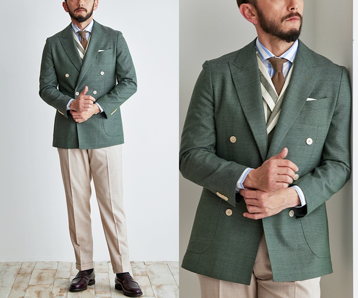 織りが美しいグリーンジャケパンスタイル。大きく内側に入ったステッチがカジュアルさをより強調し、柔らかい印象のダブルジャケットになります。薄い印象になりがちなアースカラーの上下に、特徴的な襟付きのラペルドベストを合わせたメリハリのあるコーデです。