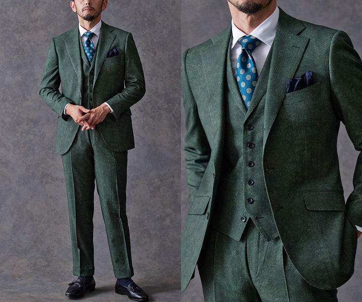 グリーンスーツの素材は、季節感や印象を大きく左右します。春夏は通気性に優れるリネンや薄手のコットンが涼しさを演出し、グリーンを合わせることでより軽やかな印象になります。秋冬はフランネルなど起毛素材が温かみと重厚感を与えます。同じグリーンカラーでも季節によって違った素材で楽しむことができます。