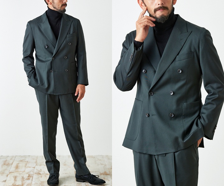 オンにもオフにも使えるカーキセットアップスタイル。ダブルジャケットはアウトポケット、スラックスはイージースラックスのため、それぞれ単品使いにも最適です。ブラックのタートルネックに紐タイプのタッセルスリッポンを合わせることで、程よいカジュアルさがあるコーデです。