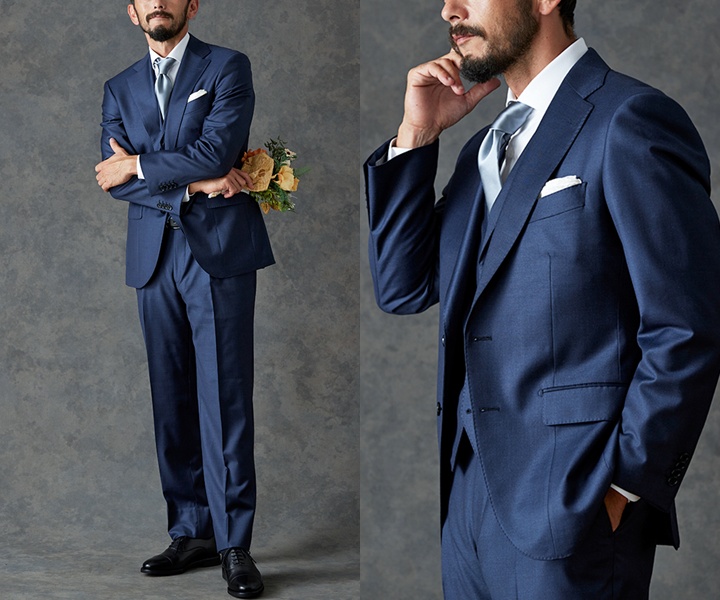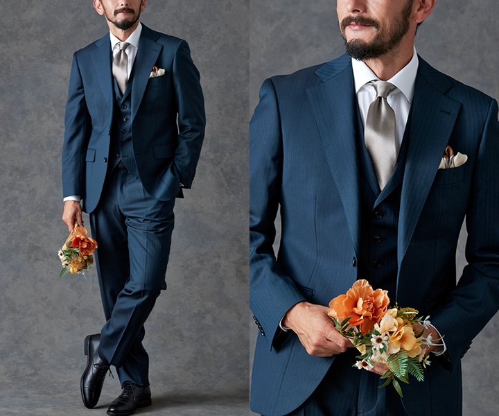 こなれ感のあるブルーグリーン無地スーツスタイル。結婚式で個性やおしゃれを重視したい方におすすめです。AMFステッチを効かせることで立体感が生まれ、しっかりと引き締まった雰囲気を演出する爽やかなコーデです。