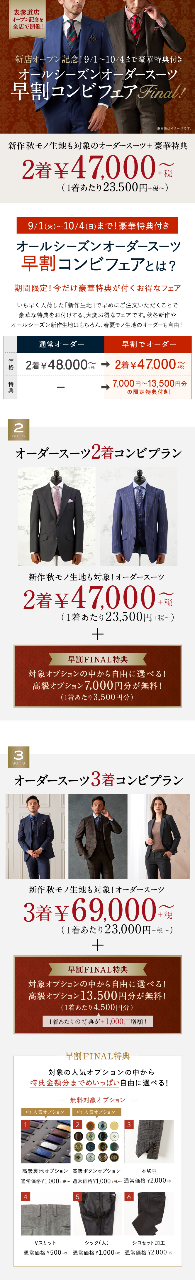 ▶本格オーダースーツ2着¥46,000~(税込¥50,600~)