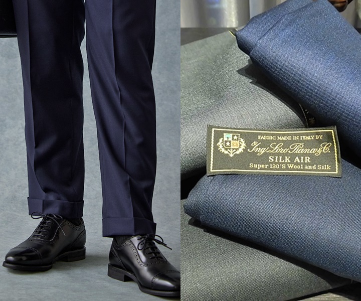 “オシャレは足元から”と言われるように、スーツスタイルにおいて、ジャケットのサイズが合っていてもパンツの裾のシルエットがダボついてしまうと残念な見た目になってしまいます。パンツ(スラックス)をオーダーする場合は、パンツの裾幅の寸法と裾丈のバランスが整っているとより綺麗に見えます。