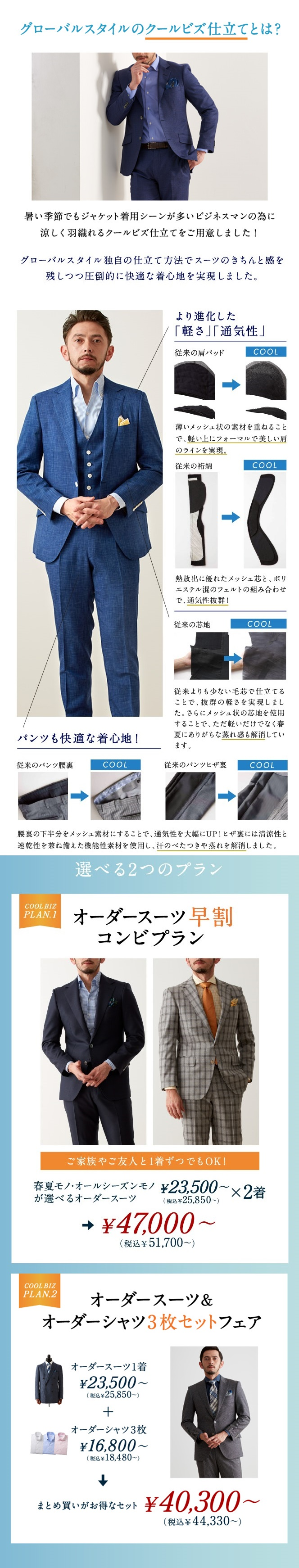 ▶本格オーダースーツ2着¥46,000~(税込¥50,600~)