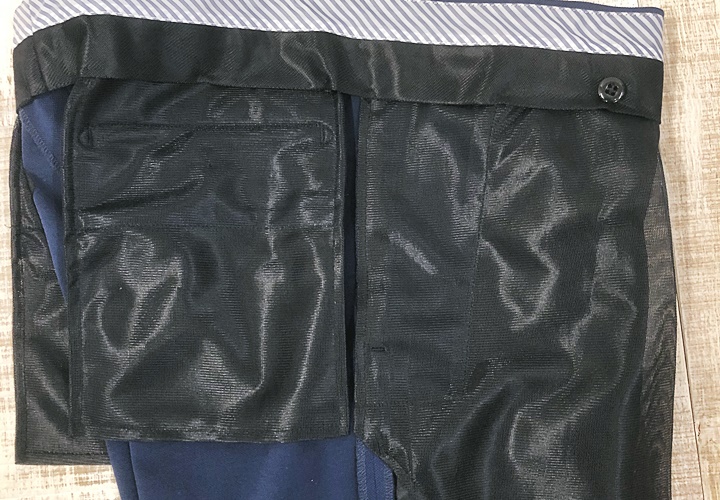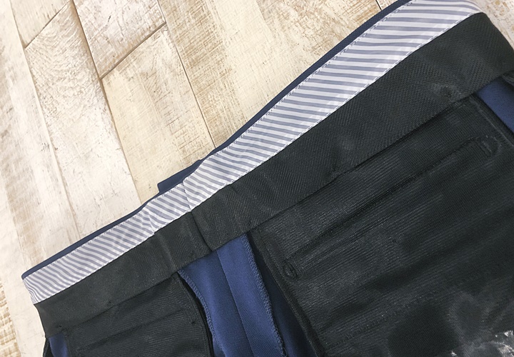 着た時に体型を綺麗に見せる為、ウエストシェイプの位置を従来より少し高く設定し、またダーツ(青の矢印)の位置も前ではなく脇に入れています。程良いウエストシェイプと高めのウエスト位置が、誰が着用しても体型をすっきりスマートに見せてくれます。