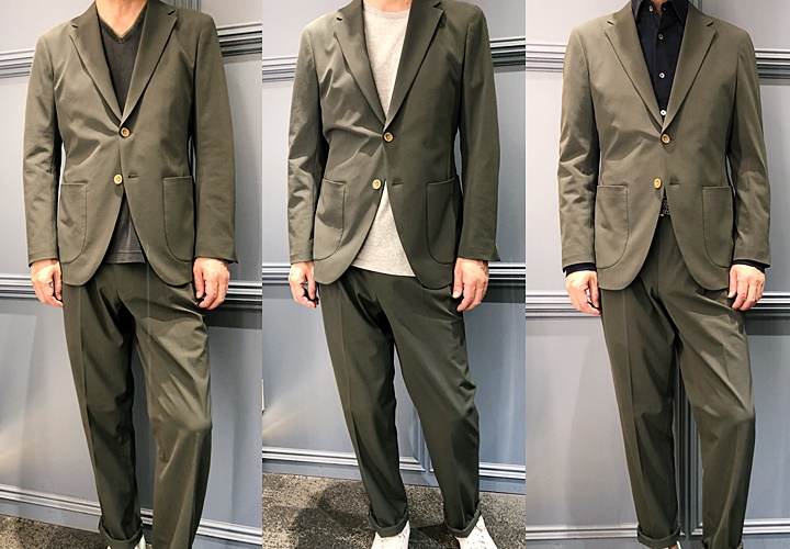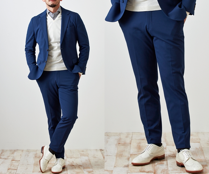 セットアップは、スーツ×ワイシャツのような紳士な装いだけではなく、インナー合わせの定番としてカットソーやTシャツとの着回しが基本的なスタイルとして欠かせないアイテムとなります。シンプルな無地はもちろん、季節に合わせてボーダーなどの柄モノを取り入れる事で着こなしの幅が広がります。